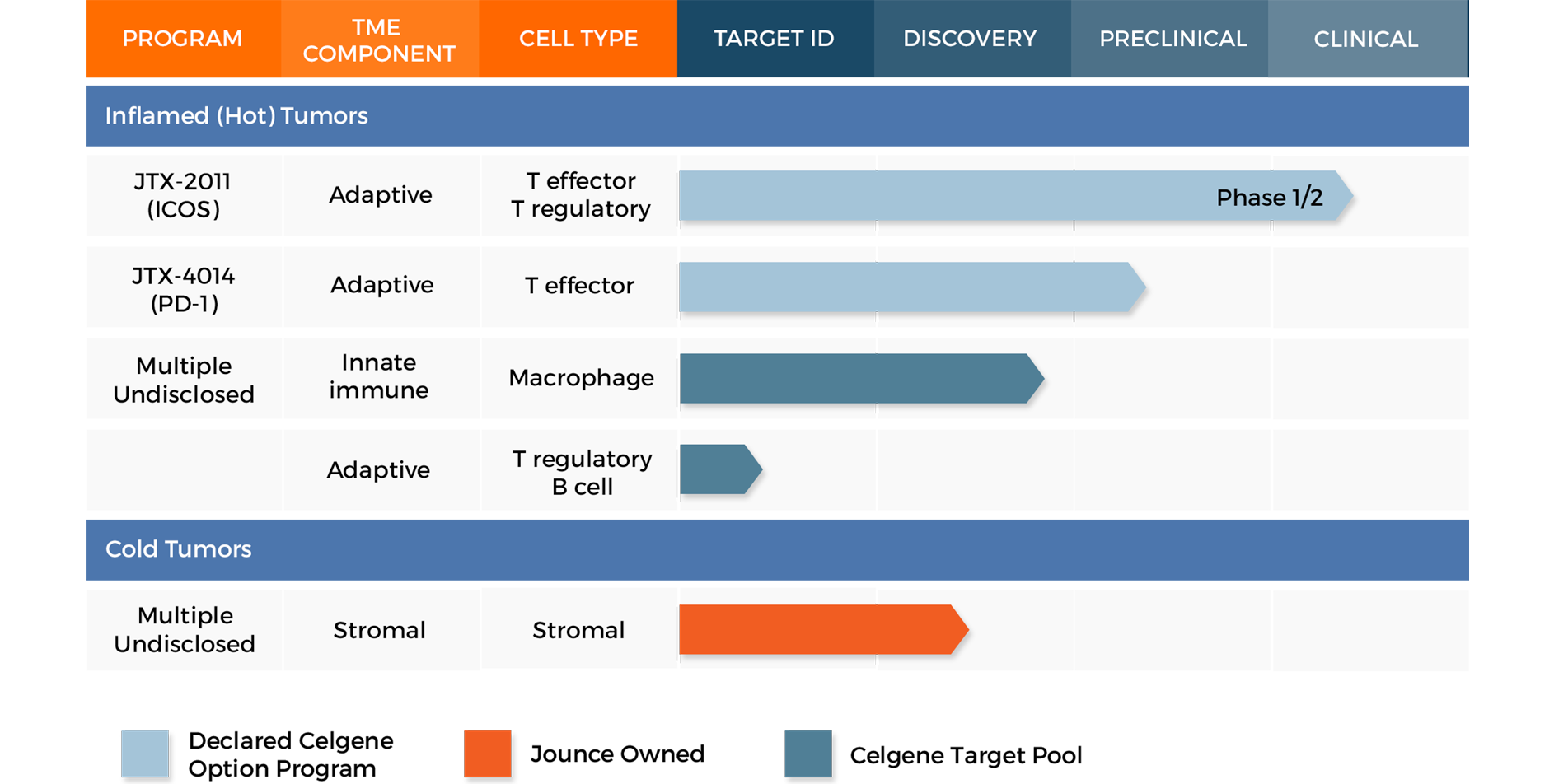 Molto più interessante il capitolo Celgene. Secondo l’accordo stipulato fra le due compagnie, in cambio dei diritti di JTX-2011 e di altri, non meglio precisati, composti, Jounce ha ricevuto $225M in upfront, un investimento in azioni pari a $36M ed è eleggibile a ricevere fino a $2,3B in milestones (distribuiti fra i vari composti). Celgene si riserva la possibilità di esercitare una o più opzioni sui vari candidati. Nel caso di JTX-2011, qualora l’opzione venisse esercitata, a Jounce spetterebbe il 60% dei profitti. Per i successivi candidati, la spartizione sarebbe la seguente: