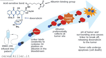 Il composto di maggior interesse per me è Aldoxorubicin, una volta conosciuto come INNO 206 o DOXO-EMCH. DOXO-EMCH è il nome assurdo che meglio definisce il farmaco: si tratta di doxorubicina (DOXO) coniugata al (6-maleimidocaproil) idrazone (EMCH). La porzione EMCH si lega all’albumina plasmatica e tende ad accumularsi nelle masse tumorali anziché nei tessuti sani. Una volta raggiunto il bersaglio, l’ambiente acido causa la rottura del legame con il linker EMCH ed il rilascio della doxorubicina nel tessuto tumorale. Sembra che stia parlando di una doxorubicina liposomiale, vero?